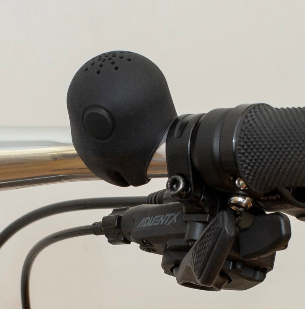The safest bicycle bell is the loudest bicycle bell. This electronic bike bell offers a choice of 5 fun sounds: Car Horn, Vintage Bicycle Bell, Whistle, Harmonica, and a Train Whistle at 85dB. The splashproof, IPX4, E-Bell comes in a silicone case. Batteries included.