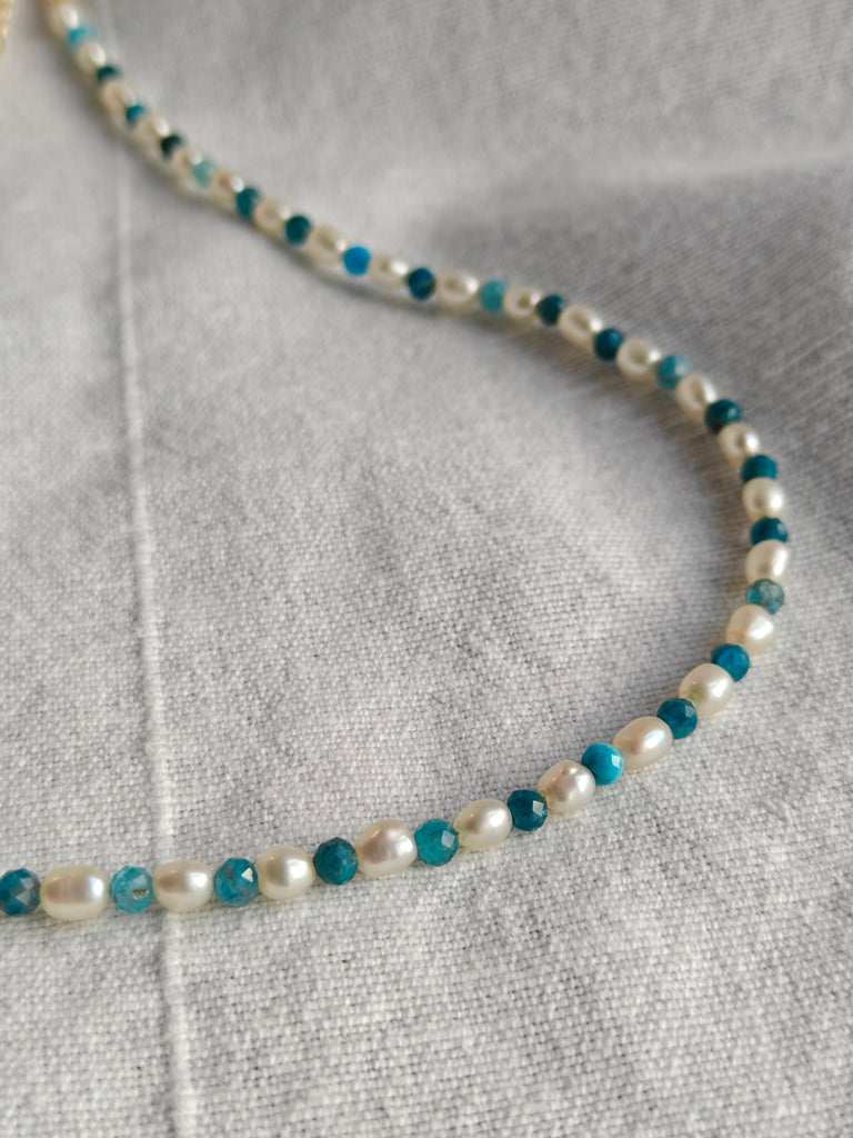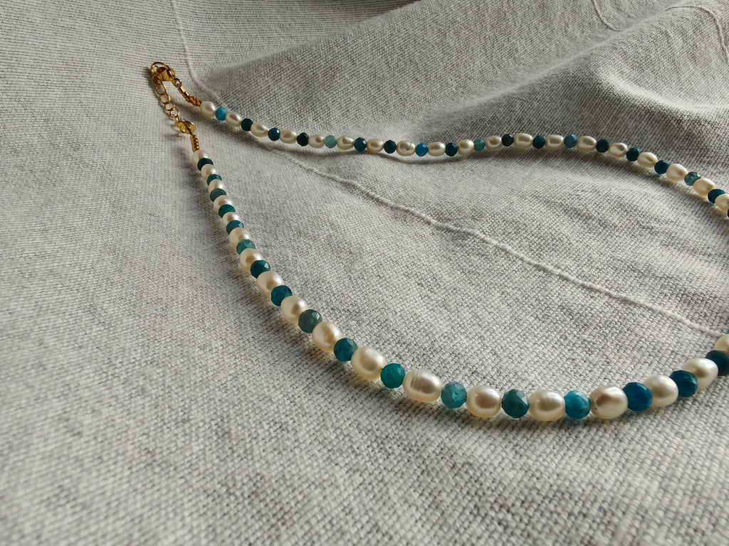 Handmade choker necklace with fresh water pearls and semi precious stones.